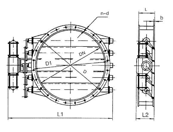 DN | D | D1 | L | L1 | L2 | b | n-d | 氣動裝置 | 風機 | 重量(kg) |