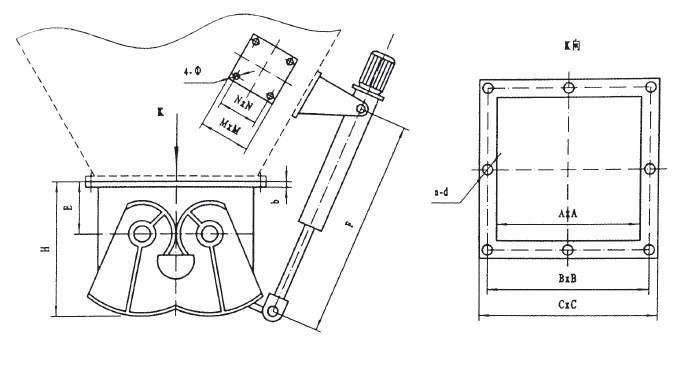 腭式閘門由本體、扇形閘板、軸、齒輪、密封件、執(zhí)行機構(gòu)等部件構(gòu)成。手動或執(zhí)行機構(gòu)推動搖桿,使齒輪帶動扇形閘板沿軸心旋轉(zhuǎn),使兩個扇形閘板向兩邊開啟,物料隨即下落,待接料裝置滿載后,再由執(zhí)行機構(gòu)帶動搖桿,使扇形閘板復(fù)位,關(guān)閉截斷下落的物料。