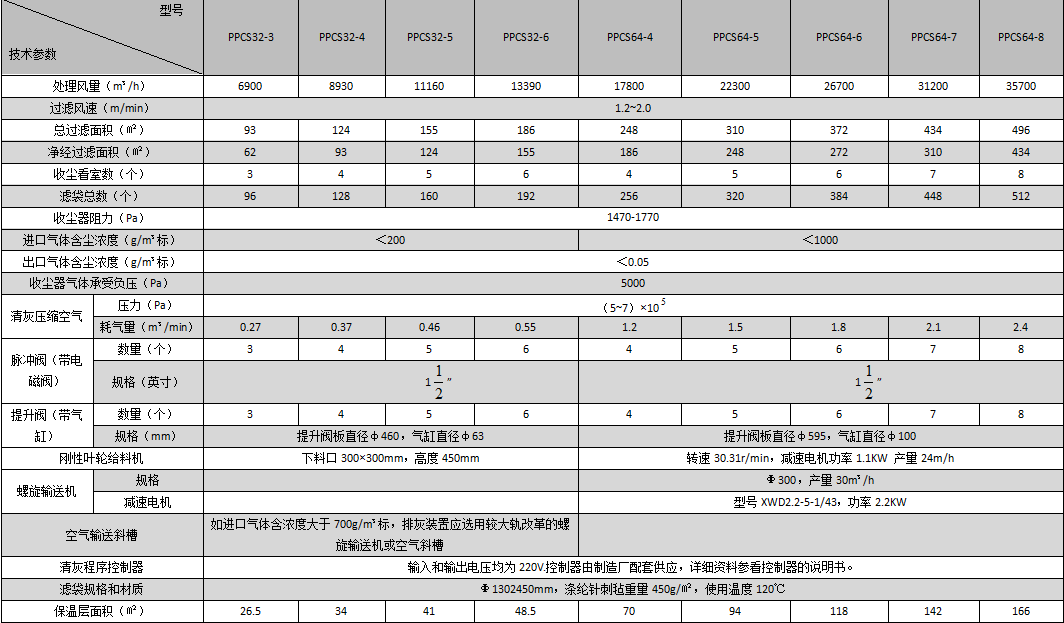 PPCS32、PPCS64型氣箱式脈沖袋收塵器技術(shù)性能表