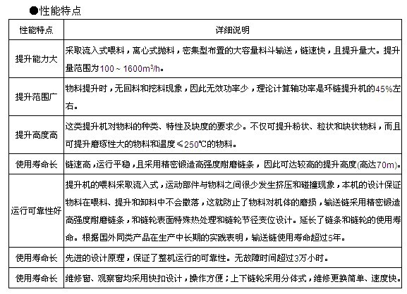該結(jié)構(gòu)性能特別適合提升輸送高溫、大顆粒、磨琢性強(qiáng)的物料。如應(yīng)用在熟料輸送系統(tǒng)、 輥壓機(jī)循環(huán)系統(tǒng)以及其它輸送條件較為惡劣的系統(tǒng)中,保證了用戶高效率,無(wú)故障運(yùn)行,充分滿足了現(xiàn)代大型水泥廠對(duì)于提升機(jī)設(shè)備可靠性、高壽命和大輸送量的高要求。