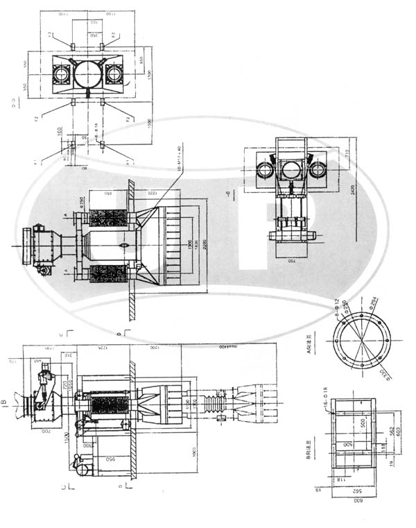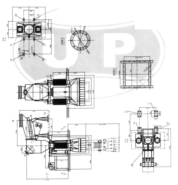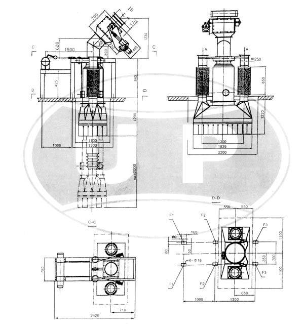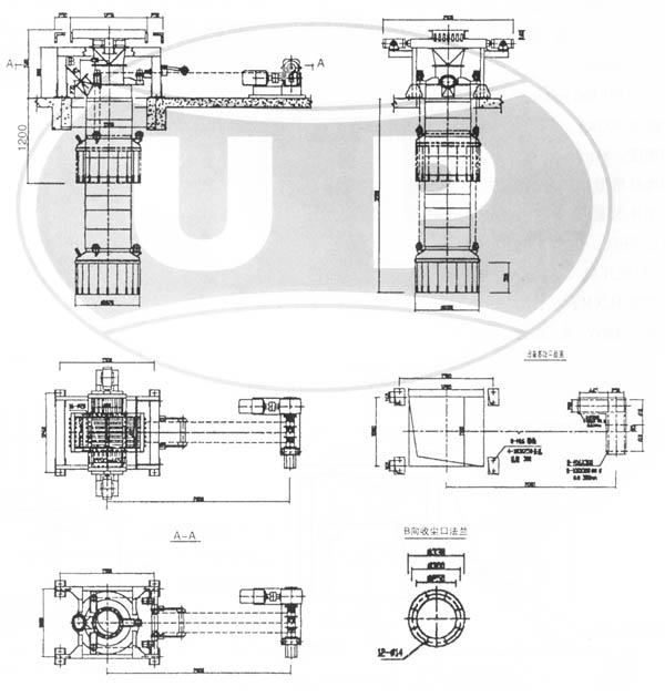設(shè)備基礎(chǔ)及埋件載荷 1.提升裝置:FV=5KN×1.5 FH=20KN×2 2.進(jìn)料口法蘭:FV=50KN 3.散裝頭基礎(chǔ):FV=4×10KN×15注四個(gè)柱腳止均為:10KN×1.5(系數(shù)) FV垂直載荷 FH為水平載荷 | 主要技術(shù)參數(shù) 1.Zui大卸料能力:200-300T/H 2.物料Zui大粒度:小于50mm 3.物料Zui高溫度:小于150° 4.含塵氣體排放量:4500m3/h 5.提升電機(jī)功率:2.2-3KW 6.設(shè)備自重:3000kg |