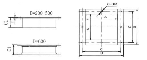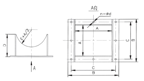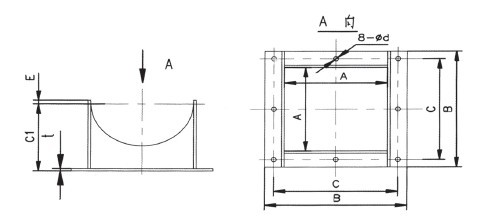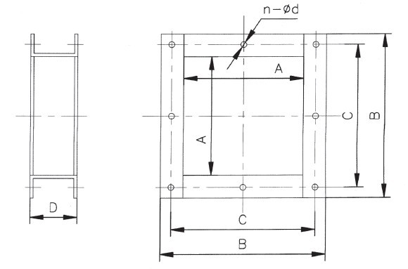 出料口的結(jié)構(gòu)表示如下圖,其系由鋼板折成的方形管及法蘭焊接而成,它不帶能關(guān)閉的出料口控制機(jī)構(gòu),在使用時(shí)將出料口焊于機(jī)殼上,其法蘭面與溜槽法蘭相聯(lián),裝配出料口的機(jī)殼還應(yīng)按出料口的內(nèi)孔尺寸開孔。