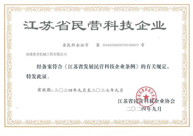 南通奧普機(jī)械工程有限公司 >> 資質(zhì)榮譽(yù) >> 江蘇省民營(yíng)科技企業(yè)證書
