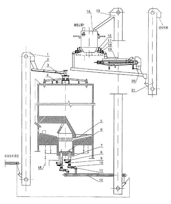MF生料均化庫采用分配器和六根斜槽呈輻射狀卸入庫內(nèi),基本形成水平料層,庫底是錐形,略向中心頃斜,中部有一中心混合室,中心室與庫壁之間的庫底分為6-14個(gè)充氣區(qū),每區(qū)設(shè)3條充氣斜槽和1個(gè)卸料孔,卸料時(shí)向兩相對(duì)區(qū)輪流充氣,在卸料口上方出現(xiàn)多股漏斗凹陷,漏斗沿直徑排成一列,隨充氣的交換而旋轉(zhuǎn)角度,這樣不但產(chǎn)生重力混合,而且生料從庫底卸入中心室后,中心室底部連續(xù)充氣,使生料又獲一次均化,由于這種庫的均化原理是以料流漏斗重力混合為主要手段,所以電耗極省,能耗僅為0.432-0.576kwh/t,均化值可達(dá)7-10,該系統(tǒng)具有高效節(jié)能,基建投資低和操作管理簡(jiǎn)便等優(yōu)點(diǎn)。
