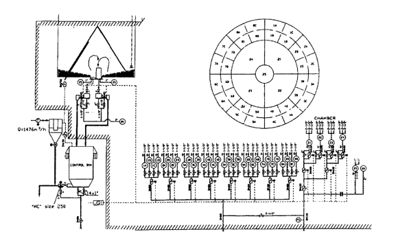CP生料均化庫是我公司引進的德國BMH公司的一種新型生料均化庫,其特點電耗低、均化效果好。CP生料均化庫的均化原理是庫頂生料通過8條斜槽均勻布料,不同時期的生料在庫內(nèi)呈橫向分布,庫底充氣系統(tǒng)設(shè)計更符合生料充氣后的流動性,呈放射狀斜向分布,環(huán)形區(qū)一般分8個區(qū),每隔5分鐘輪流充氣,充氣區(qū)生料因松動及氣流的引導卸入中心區(qū),庫內(nèi)不同層的生料豎向切割下料實現(xiàn)生料的均化,不同時間的生料進入中心區(qū)后再進行氣體強烈混合均化,從而達到理想的均化效果。