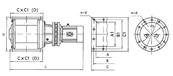 A1×A | B1×B | C1×C | DN | D | D1 | H | L | n-d | 傳動(dòng)功率型號(hào) | 功率KW | 卸灰能力 m3/h | 重量kg |